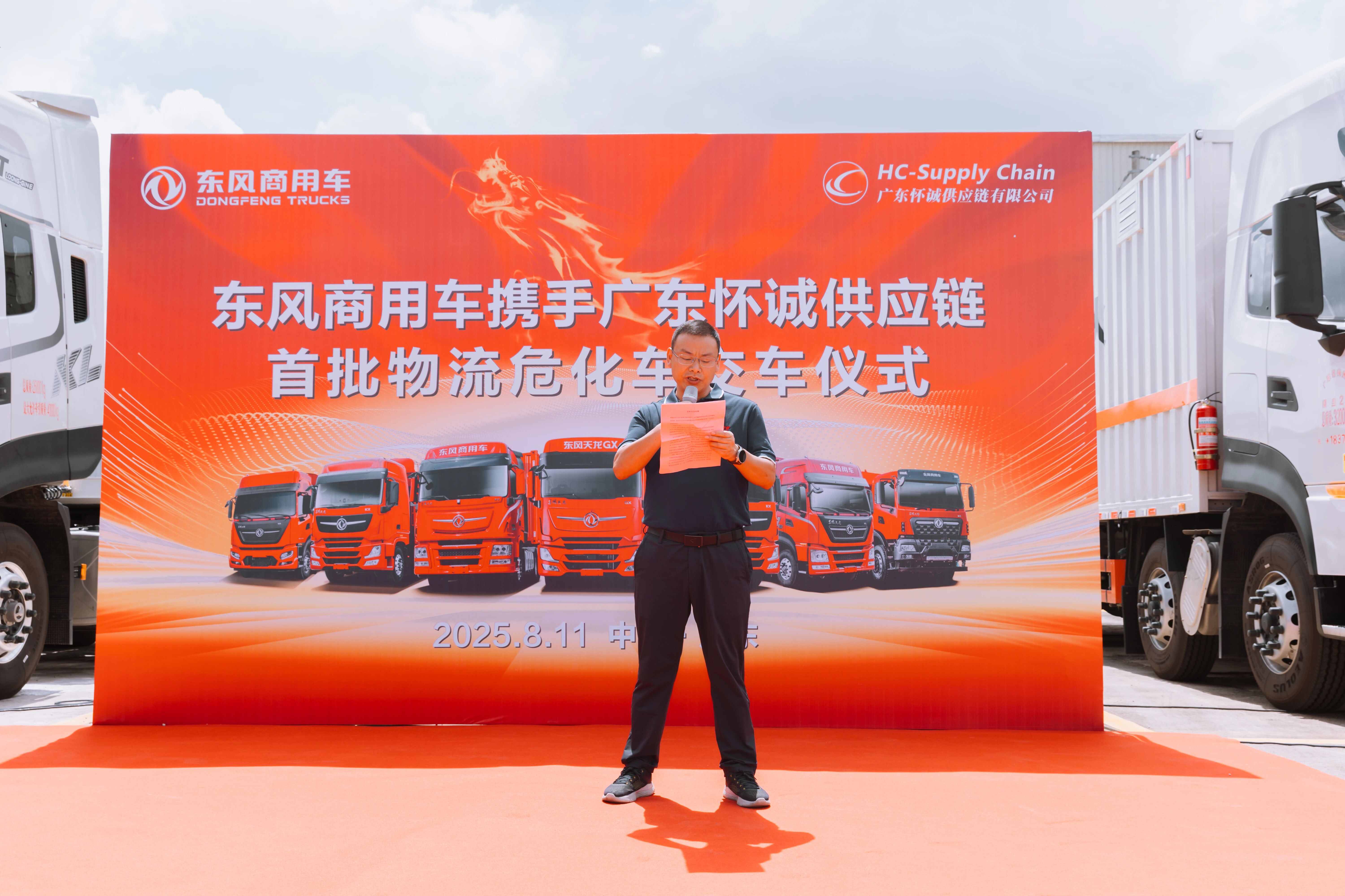 廣東懷誠供應(yīng)鏈總經(jīng)理李總在發(fā)言中,首先向蒞臨現(xiàn)場的領(lǐng)導(dǎo)、合作伙伴和嘉賓表示熱烈的歡迎與感謝,并圍繞三點展開分享:一是感恩時代機遇與政府支持,梅州、興寧優(yōu)化的營商環(huán)境和利好政策為企業(yè)發(fā)展創(chuàng)造了良好空間,公司將扎根此地回饋培育;二是堅守“安全第一、服務(wù)至上” 的初心,通過智能化監(jiān)控、標(biāo)準(zhǔn)化操作等構(gòu)建多維防控體系,此次采購的東風(fēng)?;瘜S密嚺鋫渲鲃影踩到y(tǒng)、北斗定位等,且為國六產(chǎn)品,兼顧安全與環(huán)保,以實際行動踐行理念;三是規(guī)劃未來發(fā)展,將致力于供應(yīng)鏈領(lǐng)域新質(zhì)生產(chǎn)力和高質(zhì)量發(fā)展,融入 “雙循環(huán)” 格局,助力合作伙伴提質(zhì)增效,同時推動綠色物流、智慧物流標(biāo)準(zhǔn)化建設(shè),承擔(dān)企業(yè)責(zé)任。